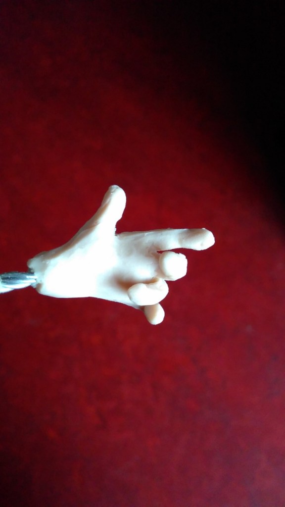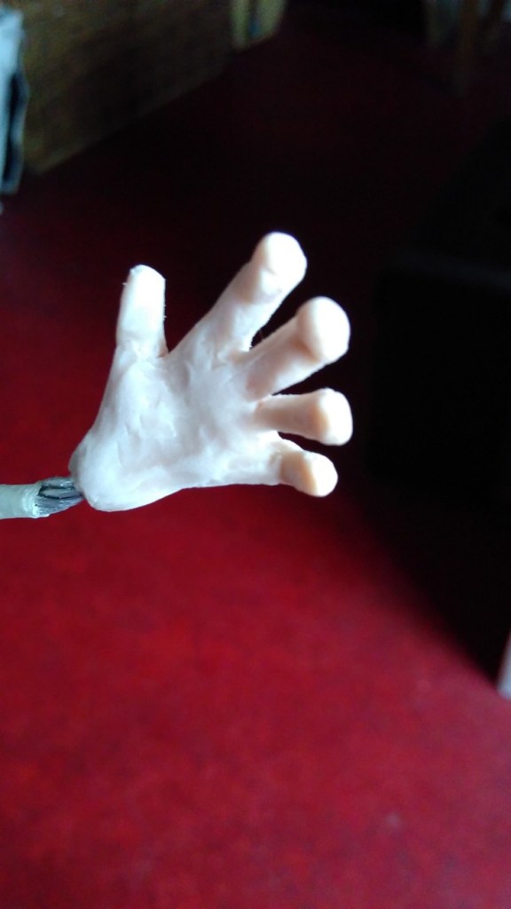Making a new puppet. Thinking of stopmotion again. The clay for the hands is a new rubber/polymer compound called Cosclay Doll – and it’s flexible! (Providing the puppet is wired first of course.)