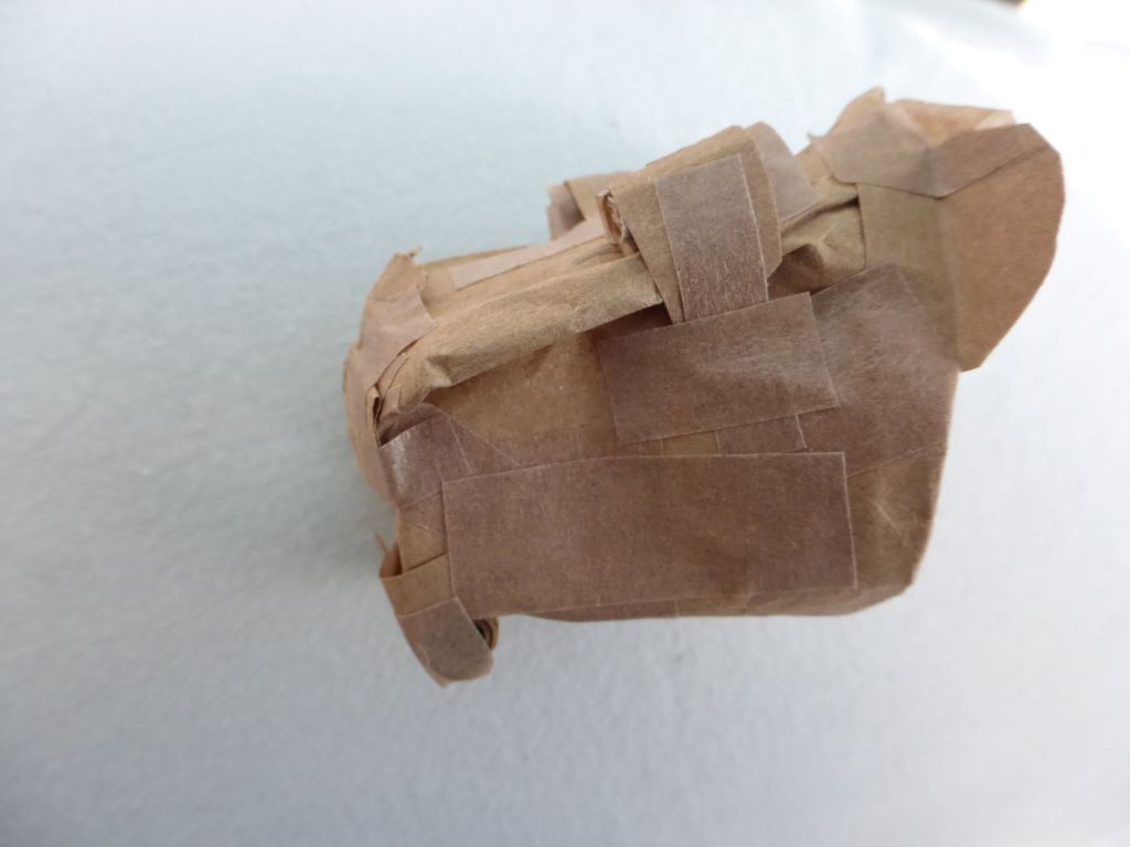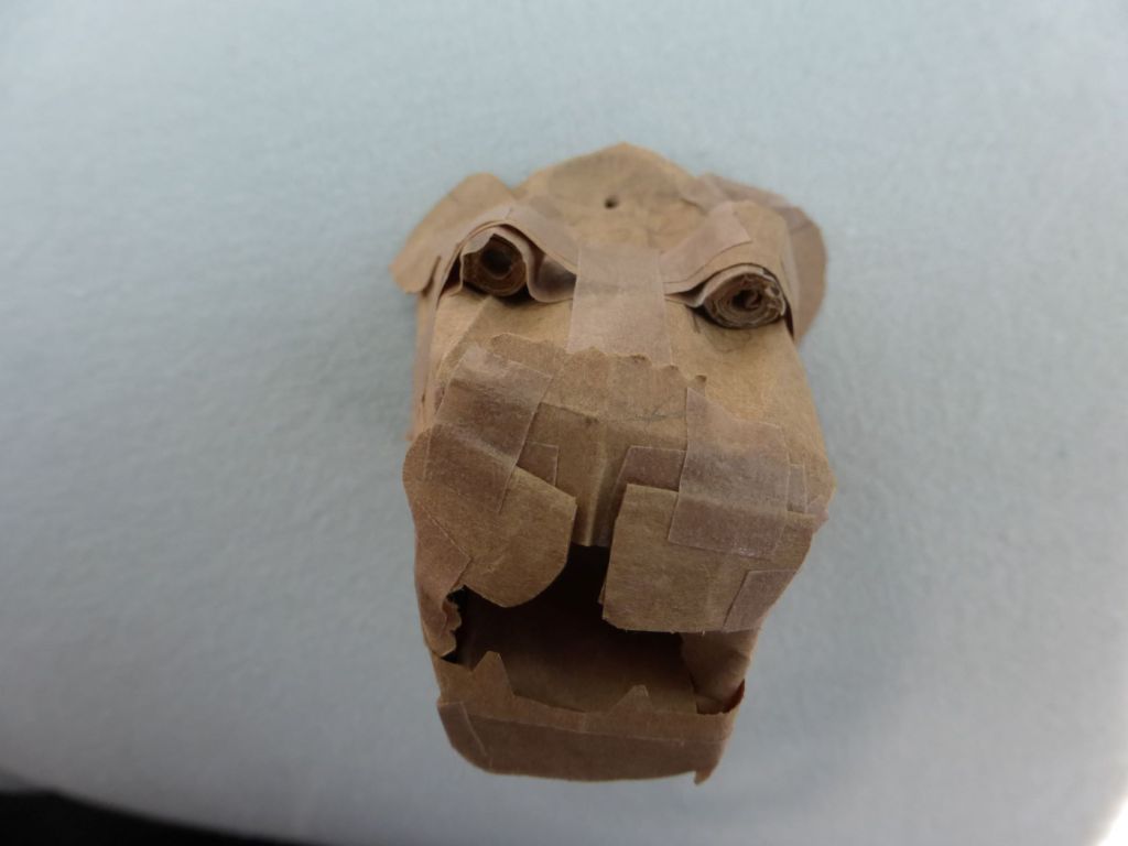 I started with the head, based on a shape built from a cork wire (the kind that seals bubbly wine!) and built up with brown bag paper and brown paper parcel tape. Recycling is the way to go.