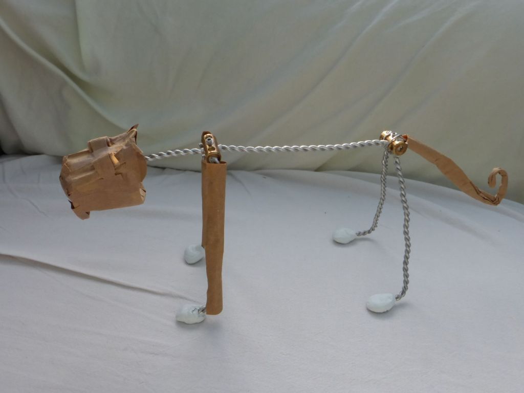 The body is alumium wire with brass joints at shoulder and hip to attach the legs. Then more brown bag paper was applied to build the “skin” of the body, legs and tail. Finally I painted stripes and markings onto the paper with solid watercolour.